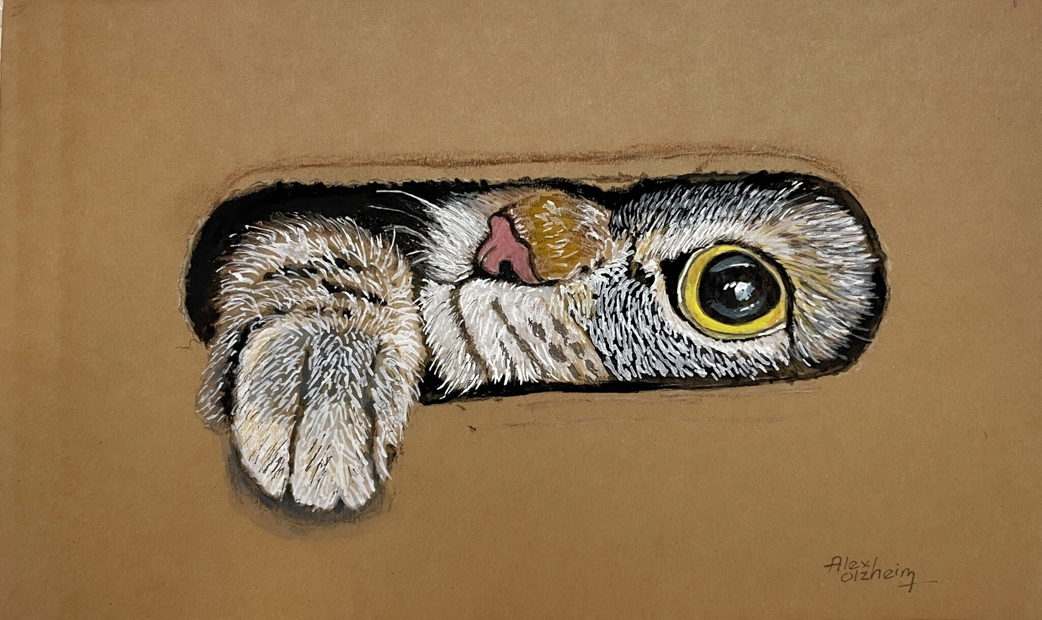 Vrij naar Mondriaan met hongerige poes 40×30 € 150 Verkocht